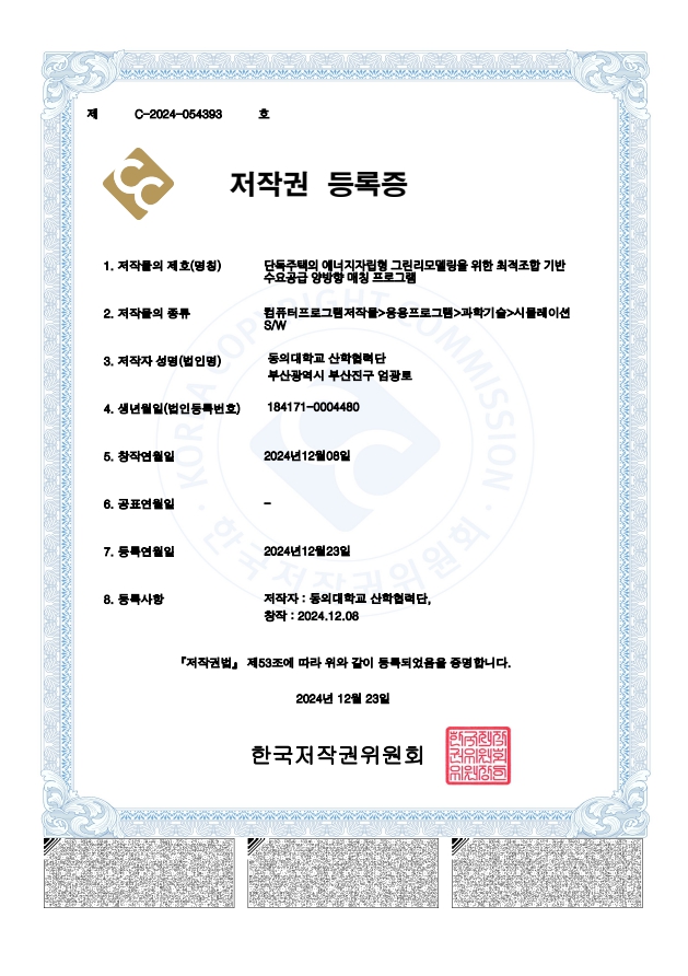 저작권 등록증_단독주택의 에너지자립형 그린리모델링을 위한 최적조합 기반 수요공급 양방향 매칭 프로그램_한국저작권위원회